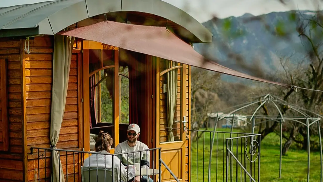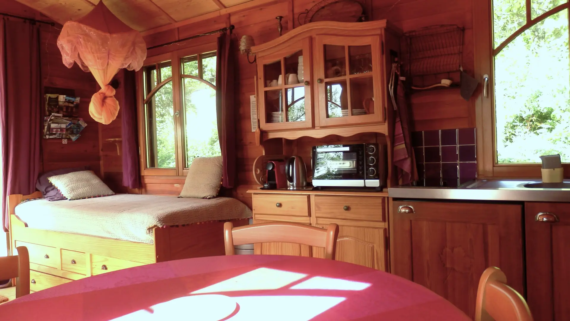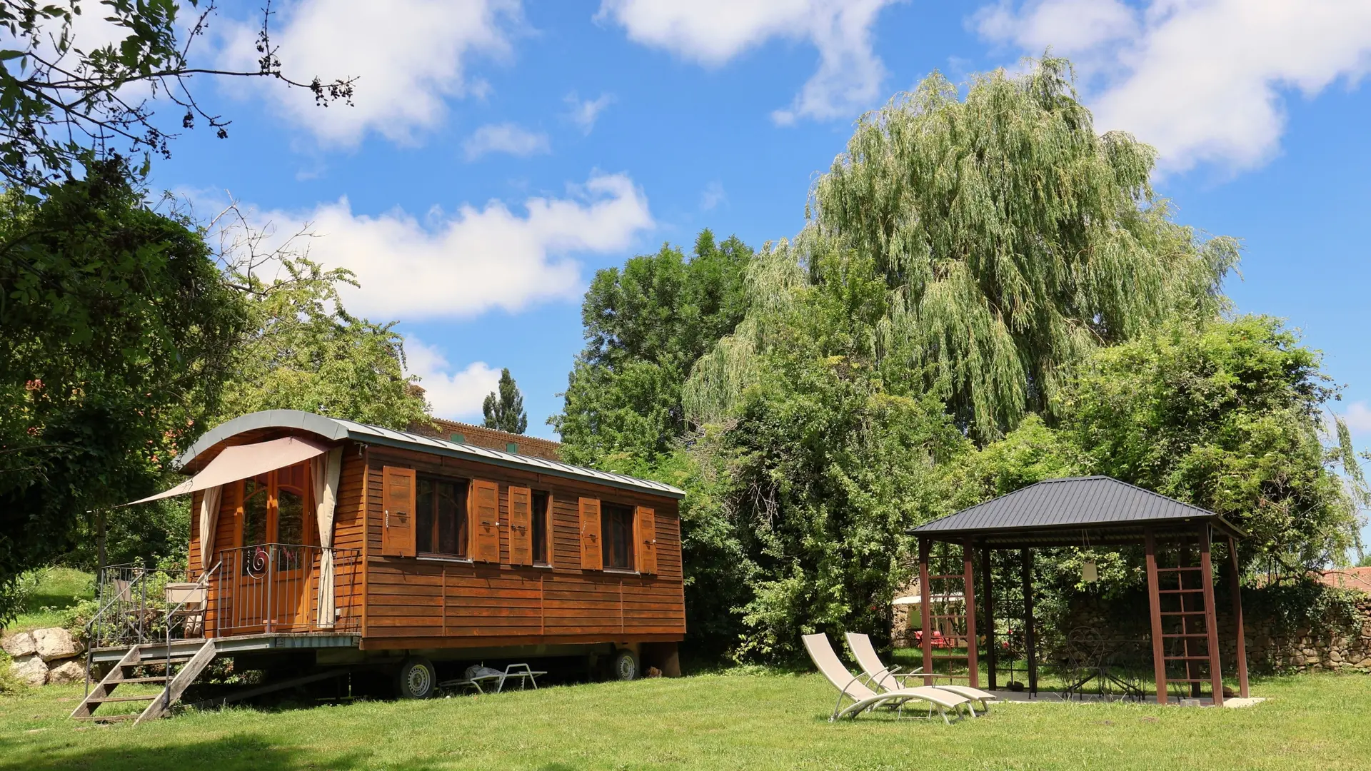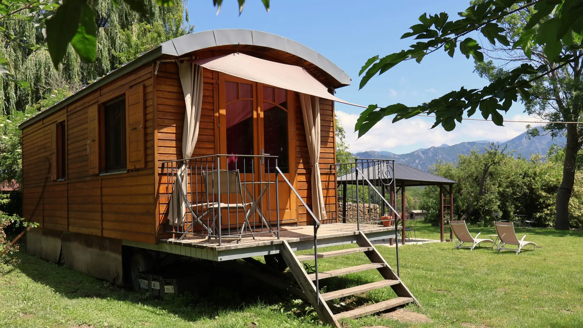La roulotte est posée sur un vaste terrain privatif face au massif de la forêt de Saoû, dans un espace semi-clos en murets de pierres sèches qui font la beauté des jardins et terrasses de notre région. D'un grand confort, elle peut accueillir de 2 à 5 personnes. Son lambris de mélèze, son parquet en chêne, ses meubles en pin ton miel, sa décoration aux couleurs chaudes créent une atmosphère chaleureuse et un agréable espace de détente. De 7,60 m de long sur 3,10 m de large vous disposerez de 22 m2 utiles, d'une salle d'eau, d'une chambre indépendante et de tout le confort moderne. Une petite terrasse de 4,7 m2 vous permettra de prendre le petit déjeuner au soleil du matin face au resplendissant massif de la forêt de Saoû. Conçue comme un chalet (ossature bois, isolant en laine de roche, contreventement en panneaux OSB, pare-pluie, pare-vapeur et bardage mélèze), avec un toit en zinc véritable, elle est très bien isolée (19 cm en toiture, 17 cm en mur) et dotée de chauffages électriques dont un avec accumulateur en fonte dans dans la pièce de vie. La roulotte est utilisable TOUTE l'année même s'il neige, pensez-y pour vos vacances d'hiver!