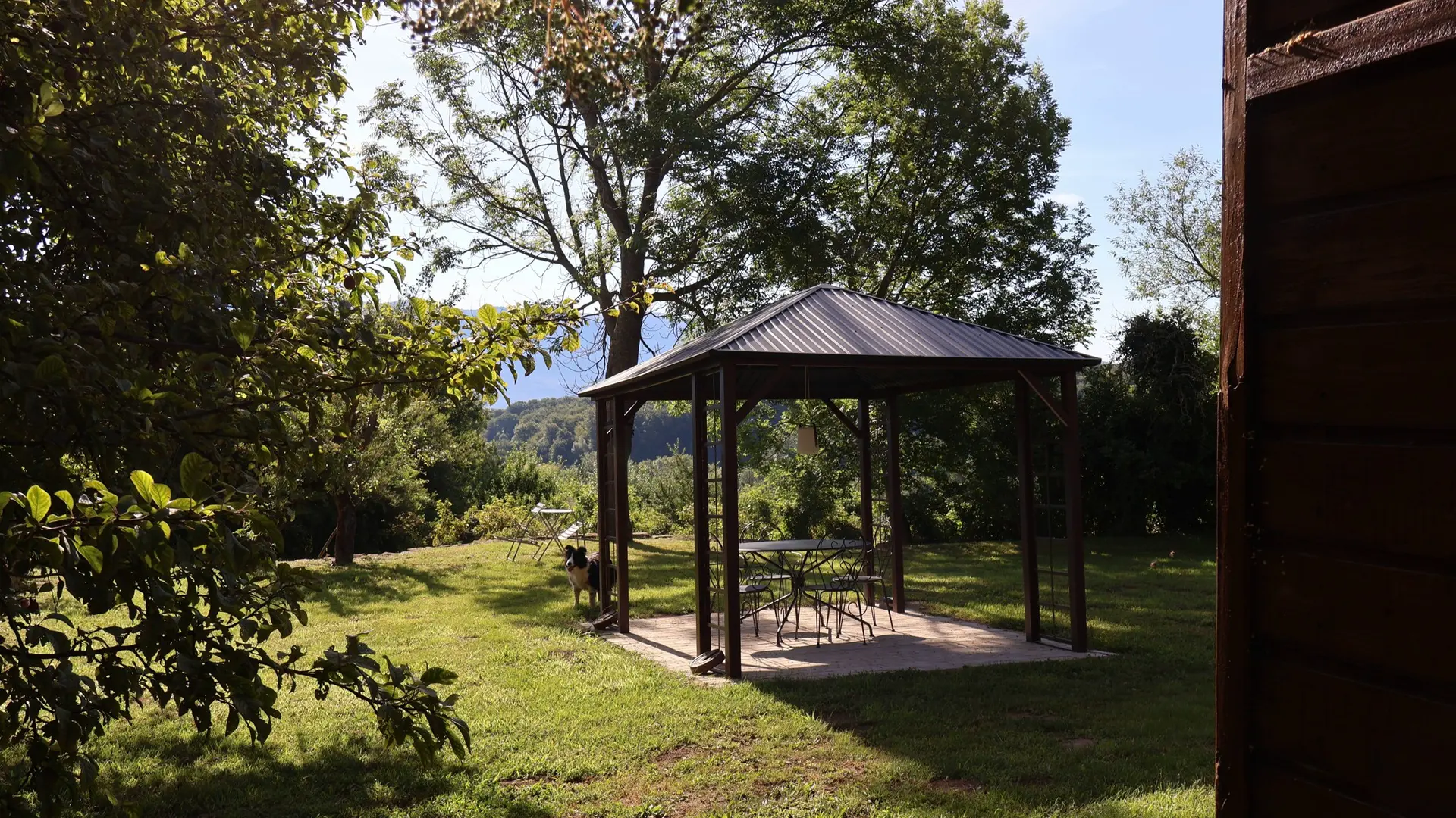 Vaste espace extérieur privatif avec tonnelle de jardin ombragée et son salon, transats, chaises longues, hamac....pour le farniente!
